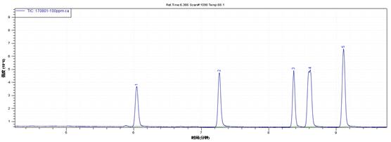 利用天瑞仪器GC-MS6800,共同复合吸附管收罗室内氛围中的苯系物和VOCs,将吸附管置于热脱附仪器中,经气相色谱分手后,用质谱停止检测。经由过程与待测方针物规范质谱图比拟较和保留时候停止定性定量,可应答室内氛围中苯系物和16种TVOC(间对二甲苯计计为一个峰)的检测。各化合物分手度杰出,线性相干系数R均大于0.9990,能够完整知足新规范的检测请求。
