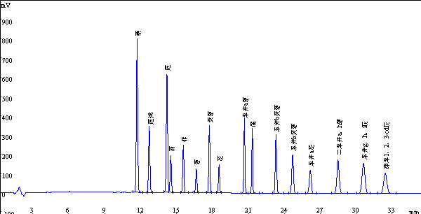 16种多环芳香烃实验室管理标准品高效液相色谱图以內: