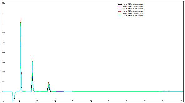 取2.0µg/mL F-、Cl-、Br-夹杂规范规范溶液反复进样6次,考查保留时候和峰面积的反复性,详见图4;此中保留时候(tR)绝对误差在0.10%-0.16%之间,峰面积(S)的绝对规范误差在0.38%~0.53%之间,反复性成果详见表1。